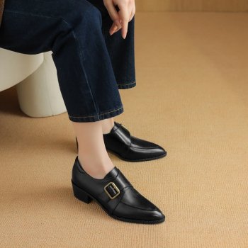 Women’s Retro Pointed Toe Oxford Shoes with Genuine Leather and Metal Belt Buckle