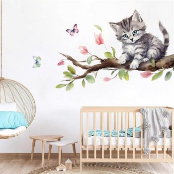 Watercolor Cute Cat on Tree Branch Wall Stickers