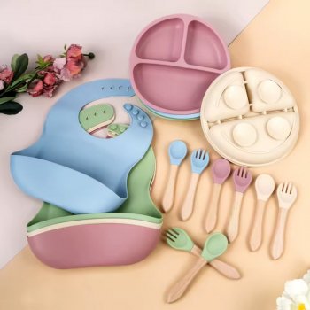 4PCS Baby Silicone Dinner Set with Suction Bowl, Plate, Spoon & Fork