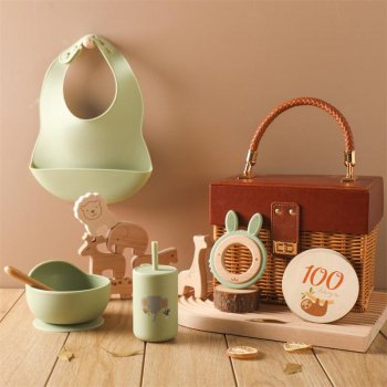 Baby Silicone Feeding Set with Wooden Milestone Cards – BPA Free, Safe & Durable