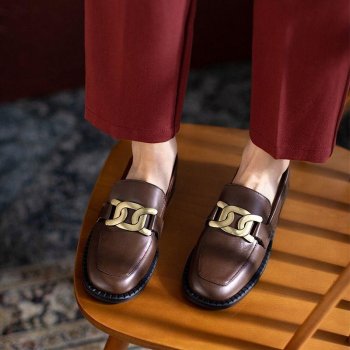 Women’s Leather Square Head Low Heel Retro Casual Shoes with Metal Accents